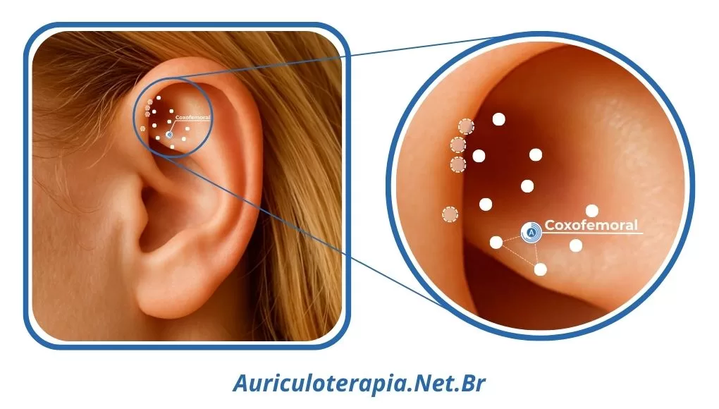 O ponto Articulação Coxofemoral localiza-se a cerca de 3mm acima da borda superior do Ramo Inferior da Anti-Hélix, formando um triângulo como ponto Ciático o ponto da Região Glútea (glúteos).